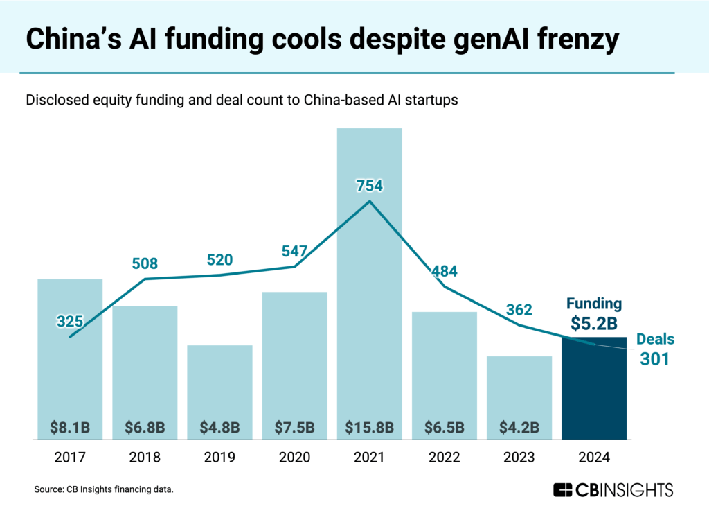 AI startup funding in China is a fraction of what US AI startups raise: China saw $5.2B in AI funding in 2024, or 7% of the US’ $76.3B.