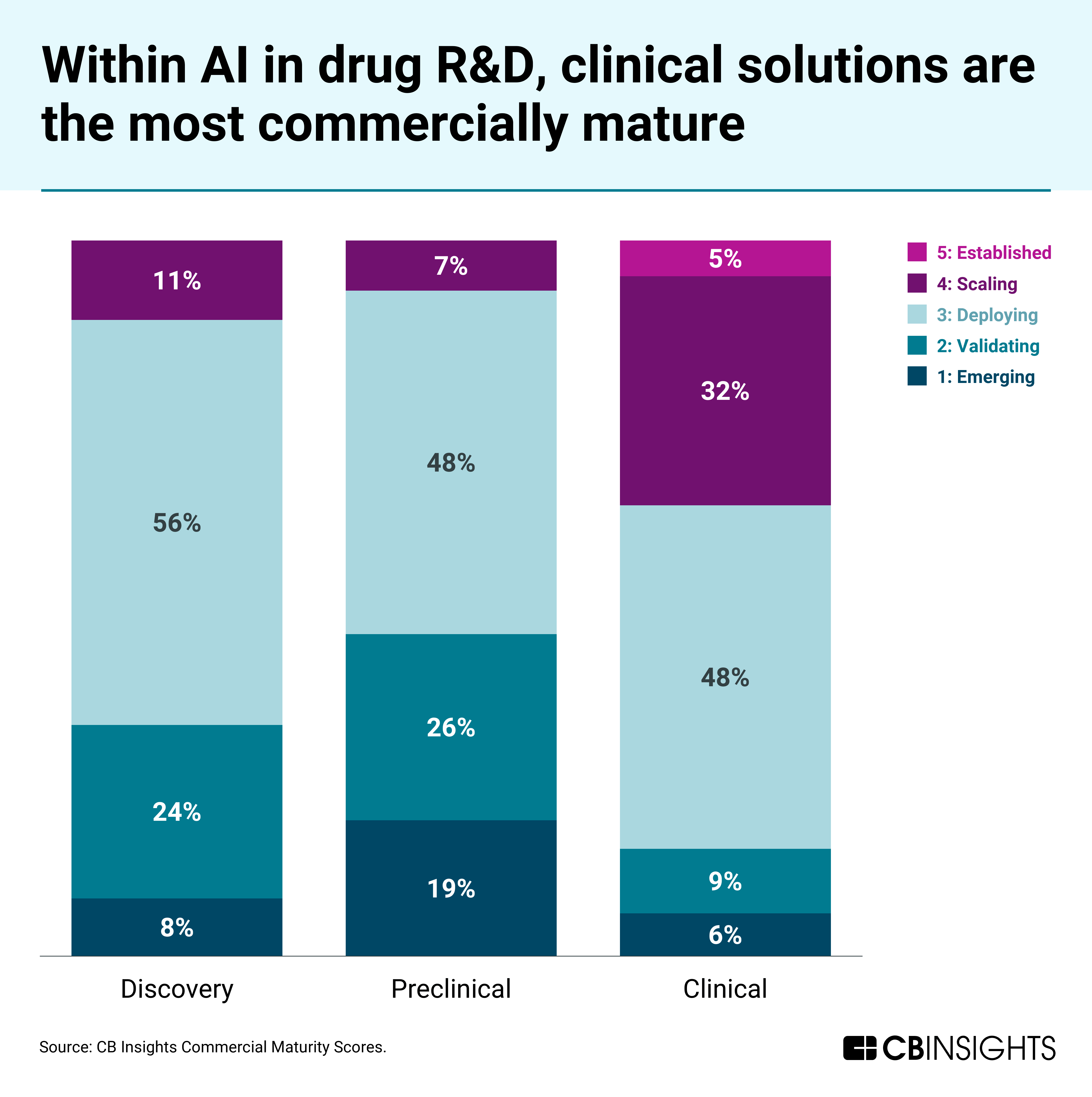 - AI tools for clinical development are more commercially mature than the emerging field of preclinical applications. According to CB Insights’ Commercial Maturity scores, 37% of clinical development companies have reached the most mature commercial stages (4: Scaling or 5: Established) compared to just 7% of preclinical companies. Late-stage funding follows a similar pattern — 9% of clinical development funding since 2023 has gone to late-stage companies, compared to just 3% for preclinical tools.