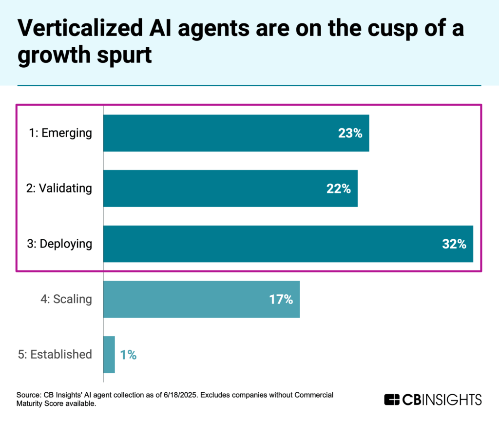 Once an obstacle for new AI applications, the most highly regulated industries have emerged as targets for agentic AI startups. 32% of verticalized AI agent companies are actively deploying solutions, and 23% and 22% are emerging and validating, respectively, suggesting an oncoming growth spurt.