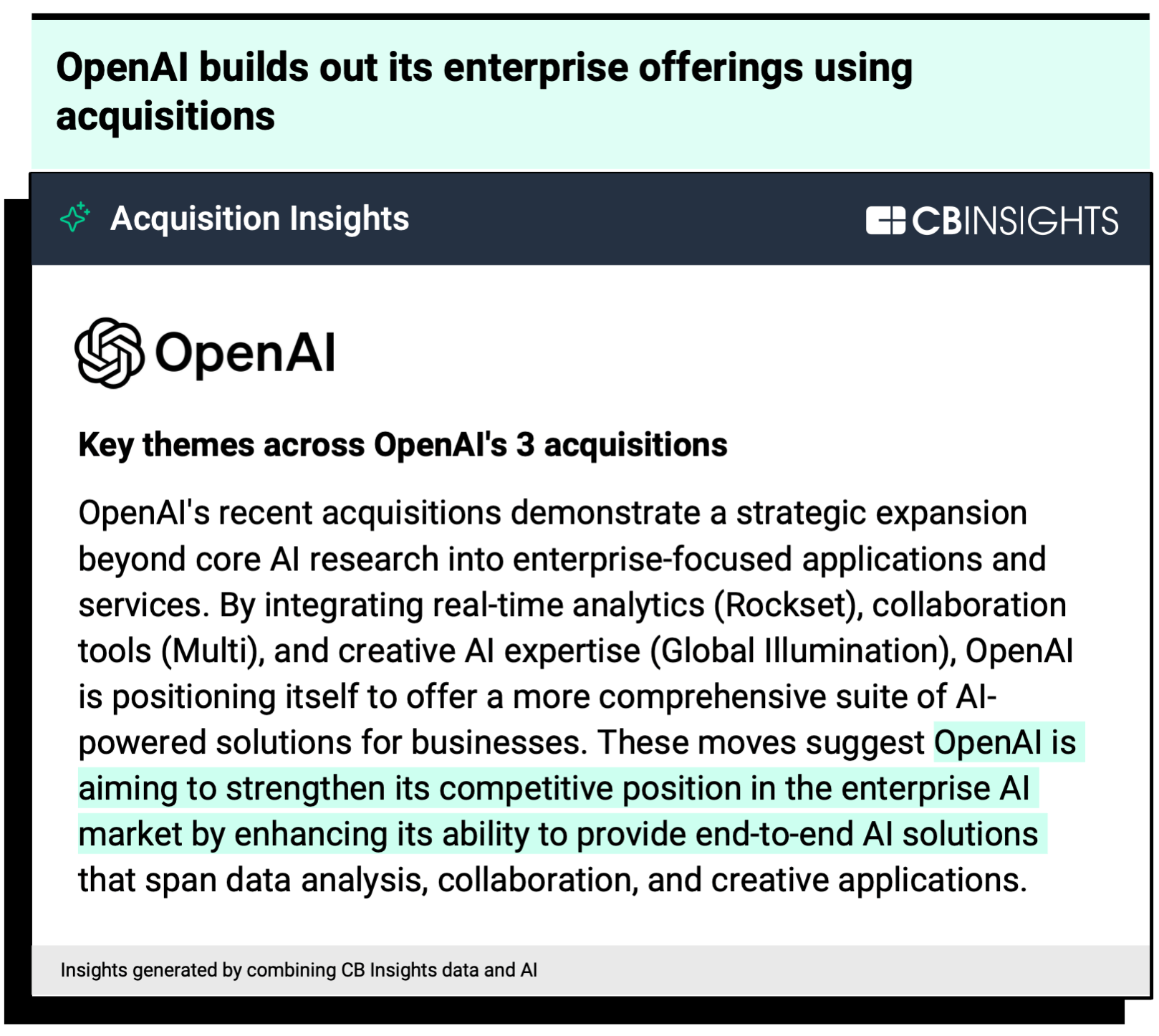 It has also acquired 3 startups in the last year to add new enterprise tech capabilities and talent, as noted in the Acquisition Insights on OpenAI’s CB Insights profile.