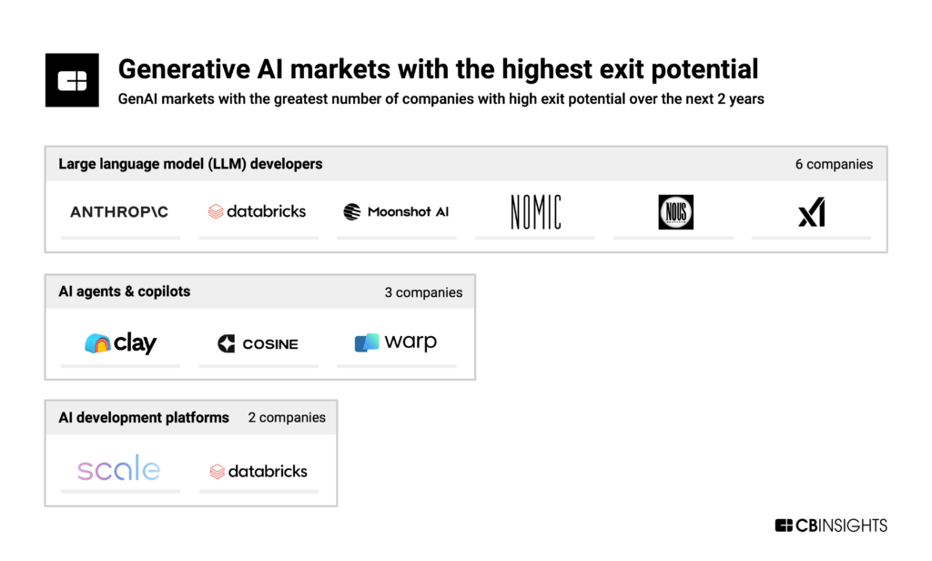 - Three markets — LLM developers, AI agents & copilots, and AI development platforms — have the highest concentration of companies with high exit probabilities.