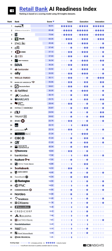 CB Insights has launched the Retail Bank AI Readiness Index — a ranking of the 50 largest retail banks in the Americas and Europe by market cap, based on their demonstrated ability to attract top AI talent, execute AI projects, and innovate through R&D and investments.