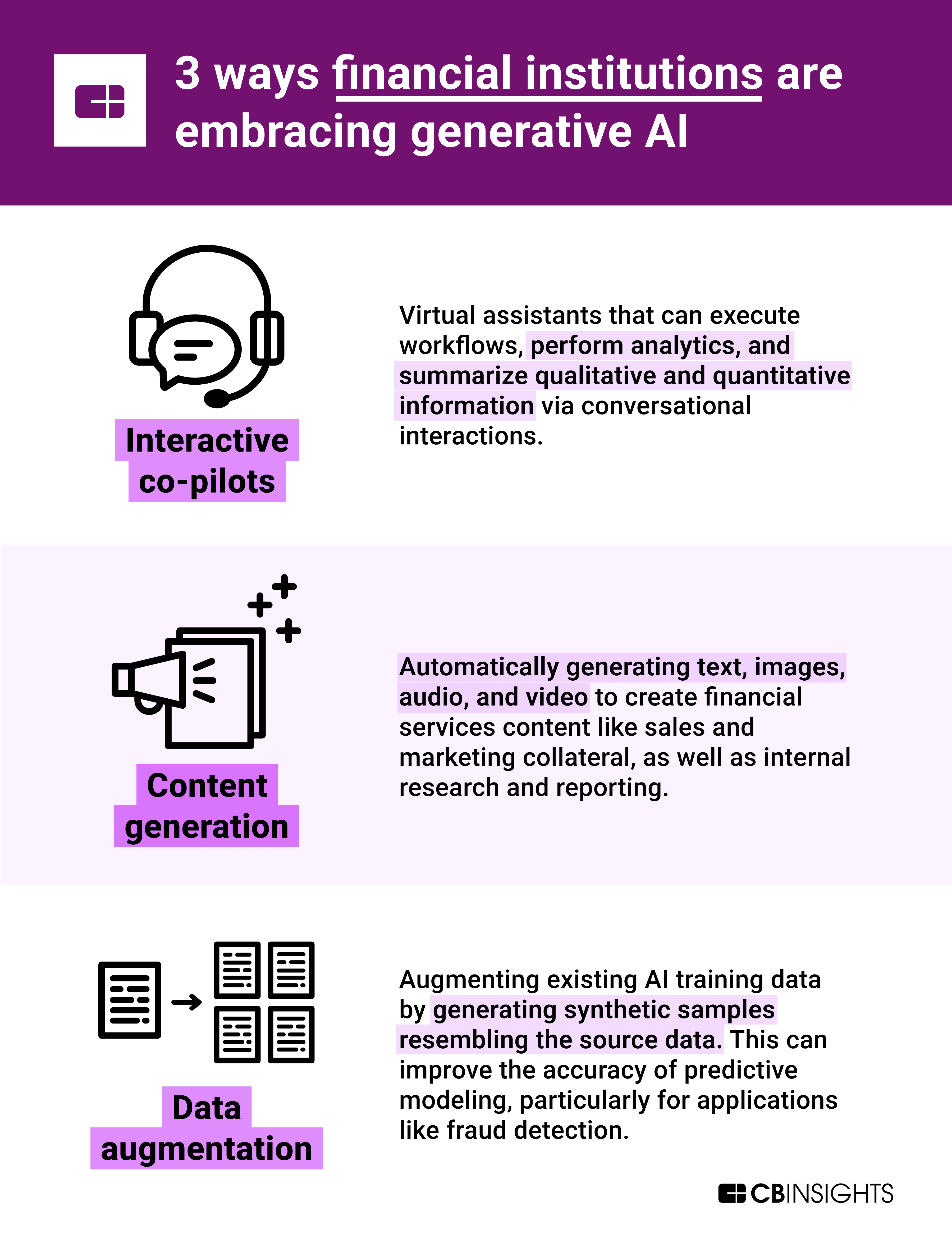 It’s still early days, but large financial services firms like Morgan Stanley, Mastercard, JPMorgan Chase, Wells Fargo, RBC, and Capital One have already launched genAI-powered initiatives, partnering with companies like OpenAI, TIFIN, Kasisto, Salesforce, and CogniCor.