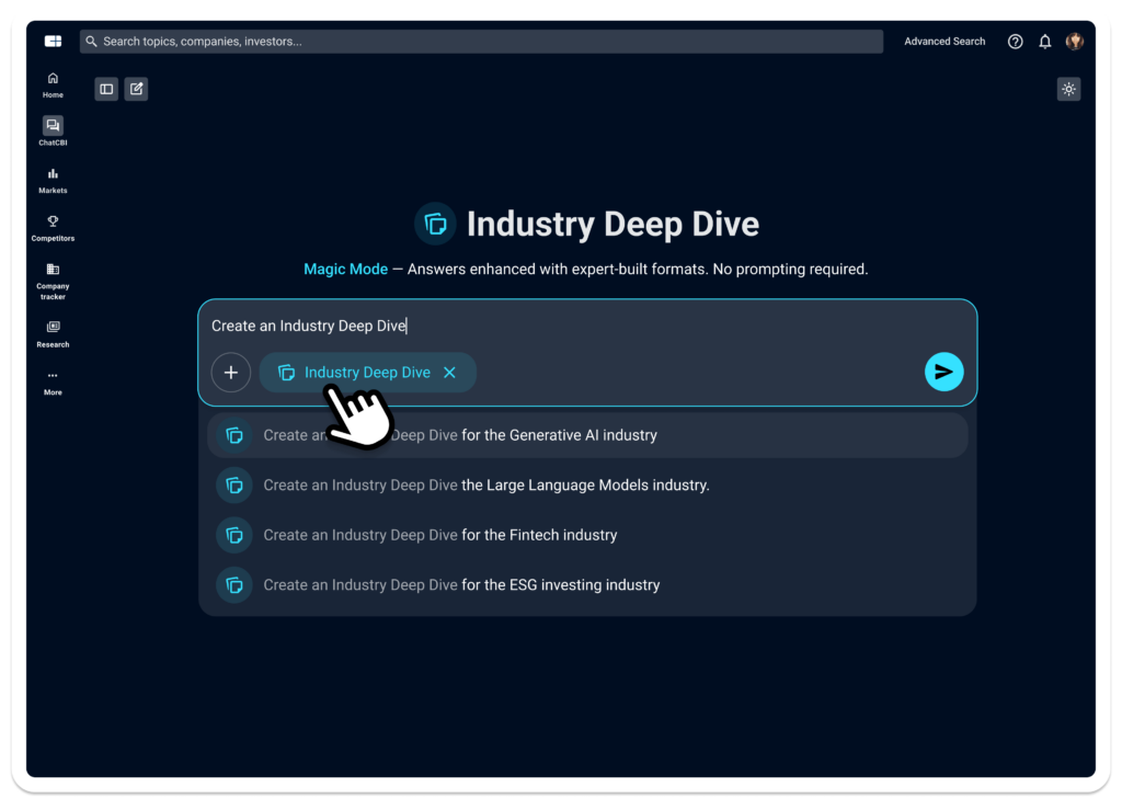 ChatCBI now does magic – expert deliverables at the click of a button. Company Deep Dives. Market Trend Reports. Industry Deep Dives. Tap the magic button, and voila.