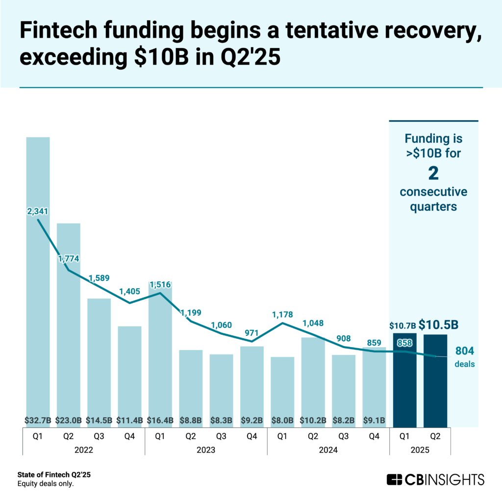 State of Fintech Q2’25 Report https://www.cbinsights.com/research/report/state-of-fintech-q225-report/ Thu, 17 Jul 2025 21:56:35 +0000 https://www.cbinsights.com/research/?post_type=report&p=174391 Fintech funding remained steady in Q2’25 at $10.5B, marking 2 consecutive quarters above $10B for the first time since early 2023. While the sector is recovering, funding remains below 2022 levels. Dealmaking fell this quarter by 7% to 804, as …