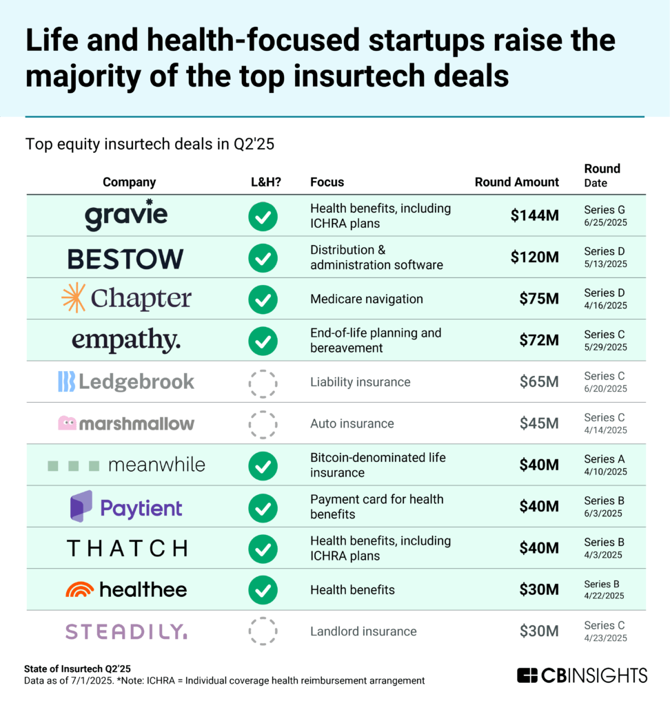 Life & health (L&H) insurtechs dominated Q2’25, outraising property & casualty (P&C)-focused counterparts for the first time in nearly 4 years.