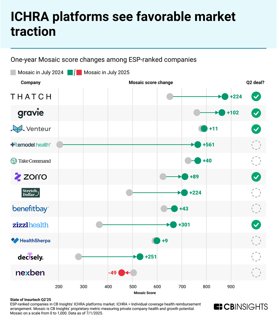 The ICHRA platforms market is seeing favorable traction, evidenced by widespread increases in Mosaic score — measuring the overall health and growth potential of private companies — among companies assessed.