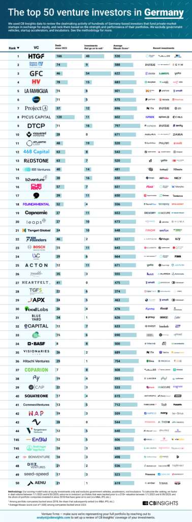 We used CB Insights data to review the dealmaking activity of hundreds of Germany-based investors that fund private-market startups in exchange for equity, and rank them based on the strength and performance of their portfolios.