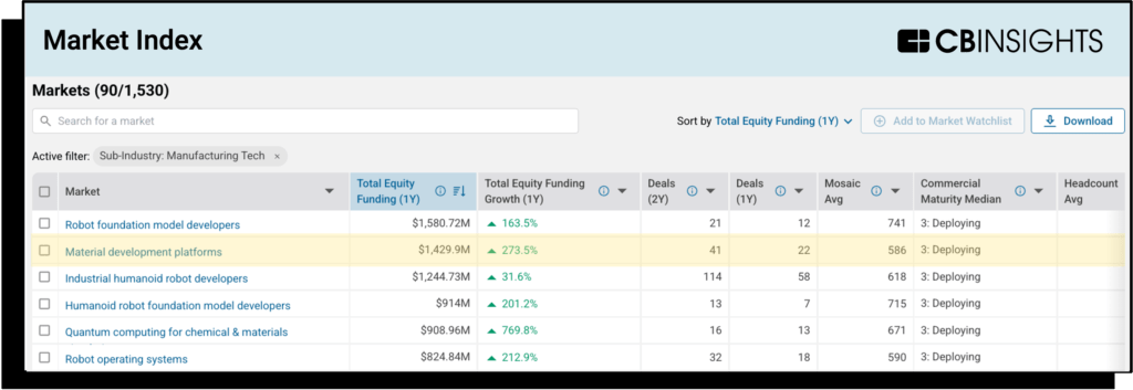 In the last year, the space has raised $1.1B in funding, a record high. When looking at the most nascent markets within the manufacturing sector (i.e., with a Commercial Maturity median of 3 or below), material development platforms rank second in total equity funding, coming in higher than humanoid robots.