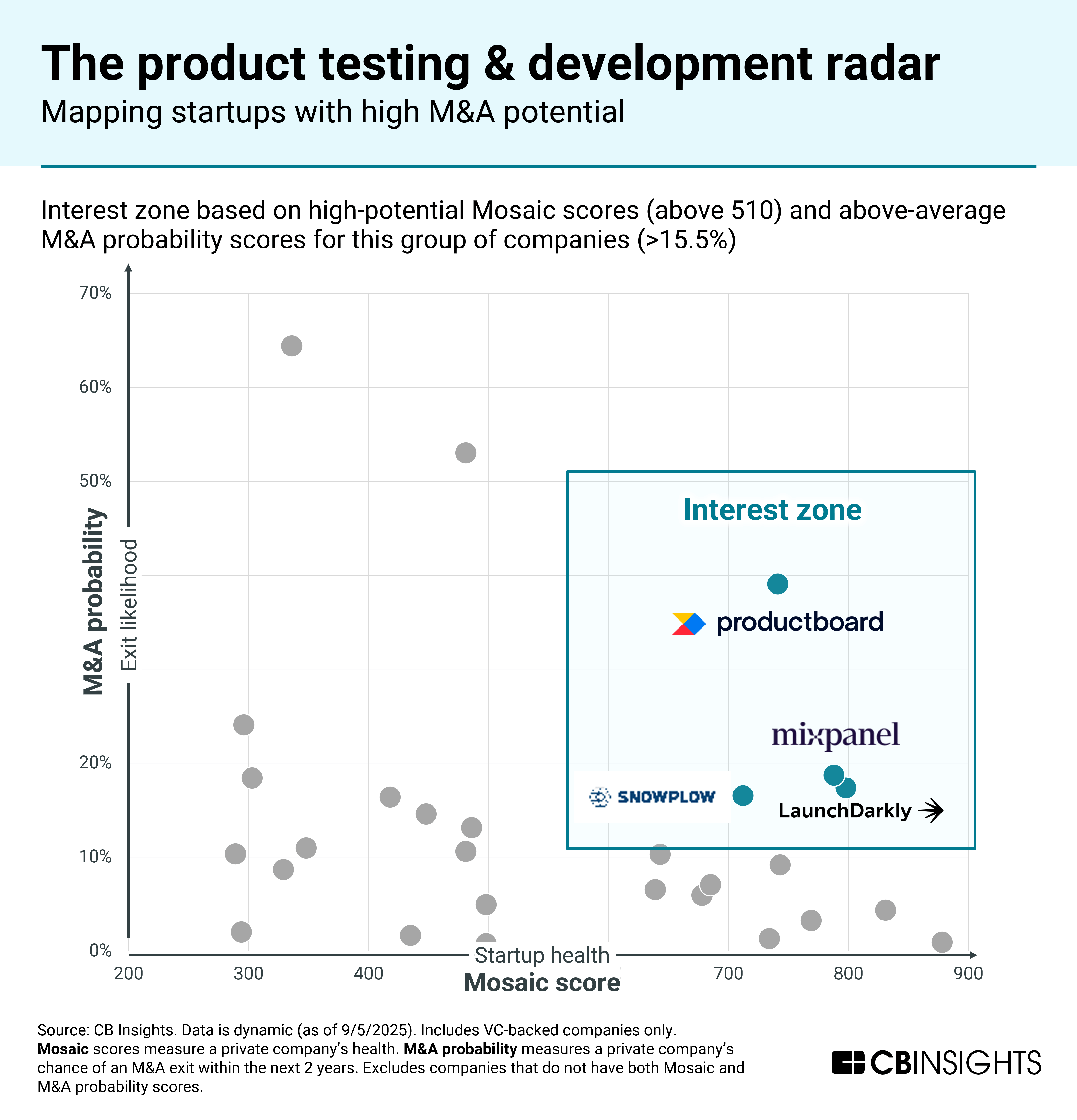 Using CB Insights’ predictive signals, including Mosaic company health scores and M&A probability, we’ve identified the product testing and development platforms that tech giants could acquire next.