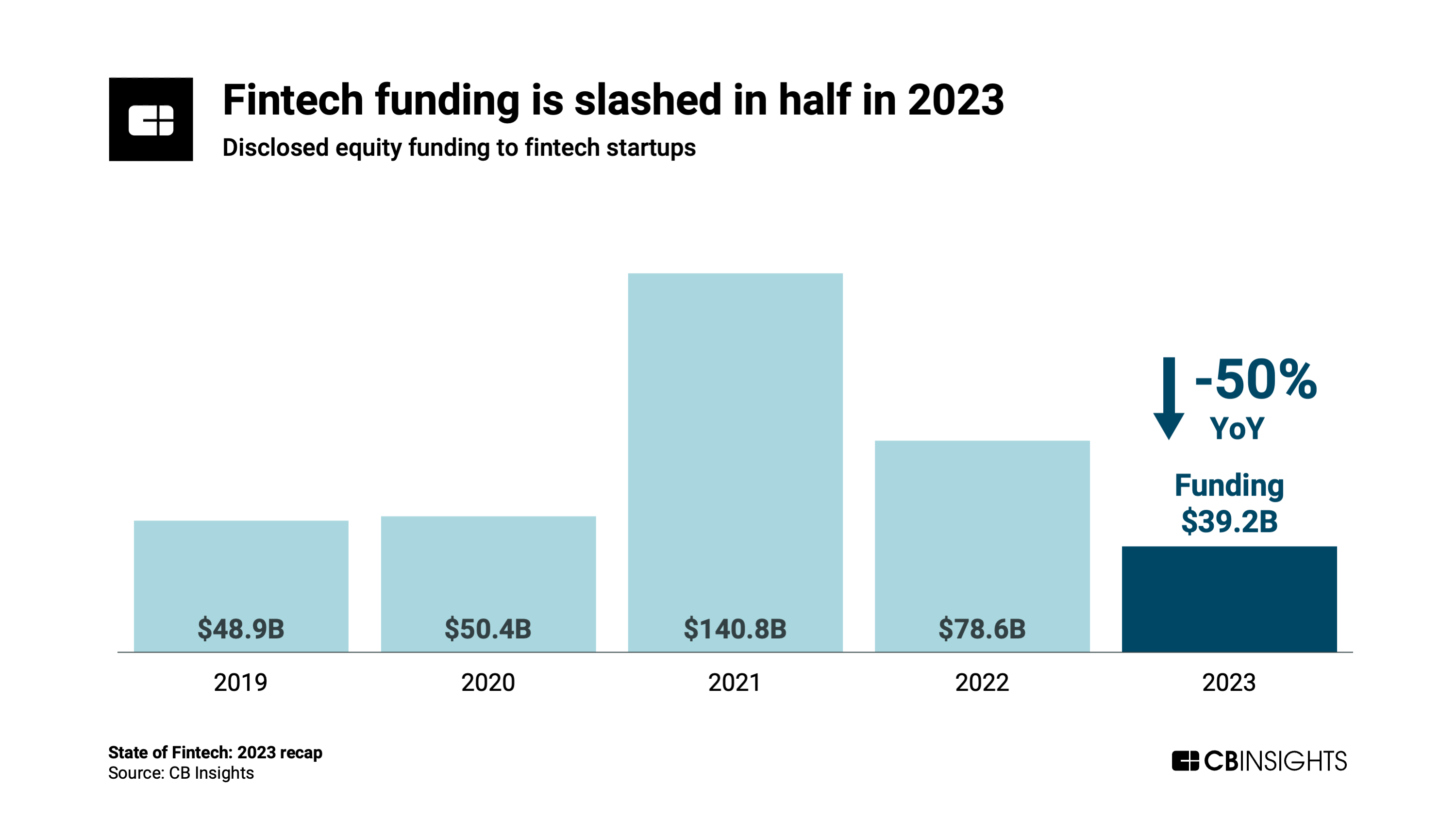 Globally, funding to fintech startups fell 50% YoY, slipping below $40B for the first time since 2017. Fintech fared worse than the broader venture market, which saw funding decline 42% YoY in 2023.