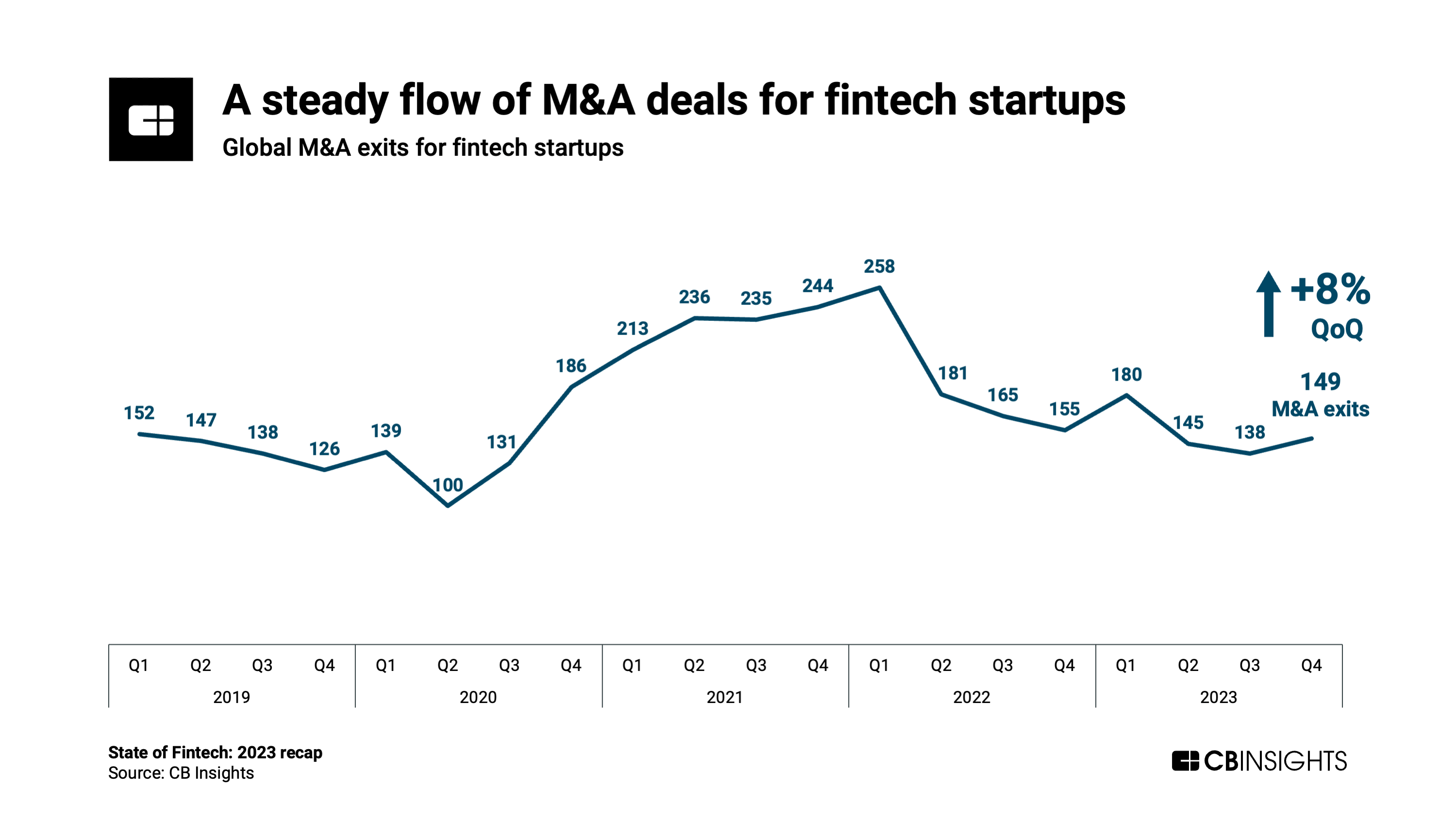 While down from a peak in Q1’22, M&A activity remains relatively steady for fintech startups. Financial services incumbents, larger fintech firms, and PE buyers continue to seek out undervalued assets. In Q4’23, global M&A volume ticked up to 149 deals.