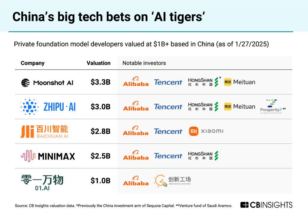 Other companies to watch in China include the “AI tigers” Moonshot AI, Zhipu AI, Baichuan AI, MiniMax, and 01.AI — all of which have nabbed $1B+ valuations backed by China’s big tech companies.