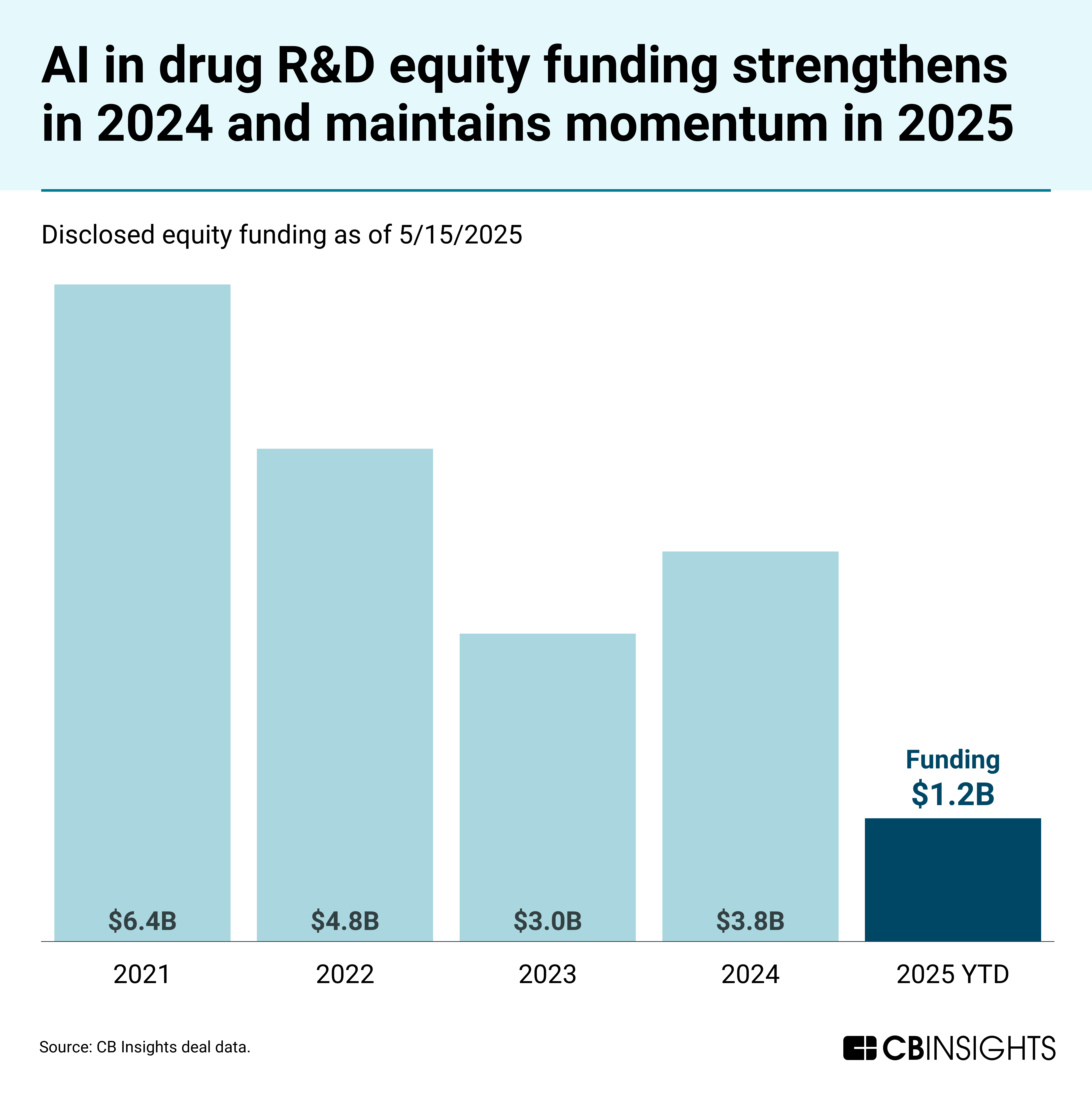 After declining YoY between 2021 and 2023, equity funding across AI in drug R&D rebounded in 2024, growing from $3B to $3.8B and significantly surpassing pre-pandemic levels ($2.7B in 2019). The momentum continues in 2025, which, after Q1, is on pace to match 2024’s performance, bolstered by Isomorphic Labs‘ $600M Series A round in March 2025.
