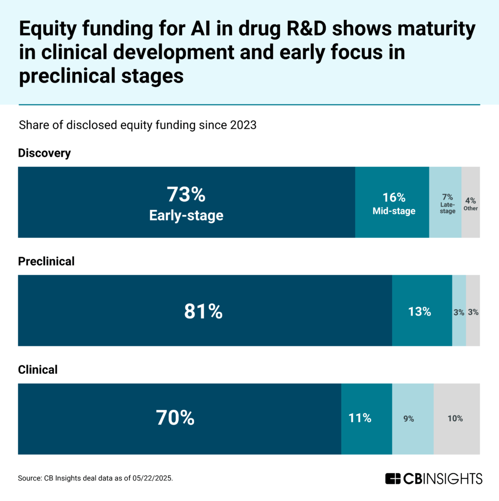 - AI tools for clinical development are more commercially mature than the emerging field of preclinical applications. According to CB Insights’ Commercial Maturity scores, 37% of clinical development companies have reached the most mature commercial stages (4: Scaling or 5: Established) compared to just 7% of preclinical companies. Late-stage funding follows a similar pattern — 9% of clinical development funding since 2023 has gone to late-stage companies, compared to just 3% for preclinical tools.