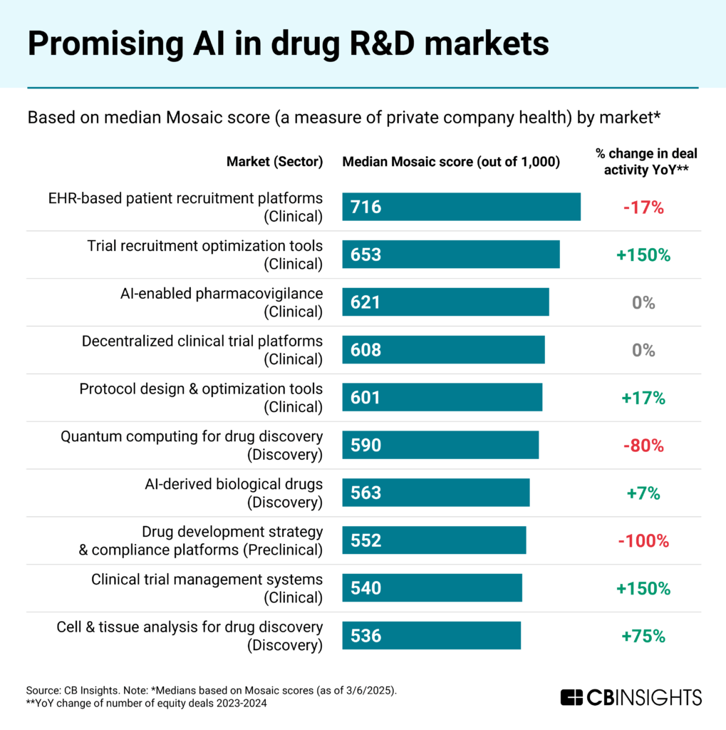 - Patient recruitment platforms and clinical trial management systems demonstrate the strongest momentum. Examining market performance through average CB Insights Mosaic scores (a proprietary measure of private-company health and growth), EHR-based recruitment platforms lead (716 out of 1,000), while trial management systems show highest deal growth (+150% YoY). Look to these markets as high-growth areas to track within the AI drug R&D space.