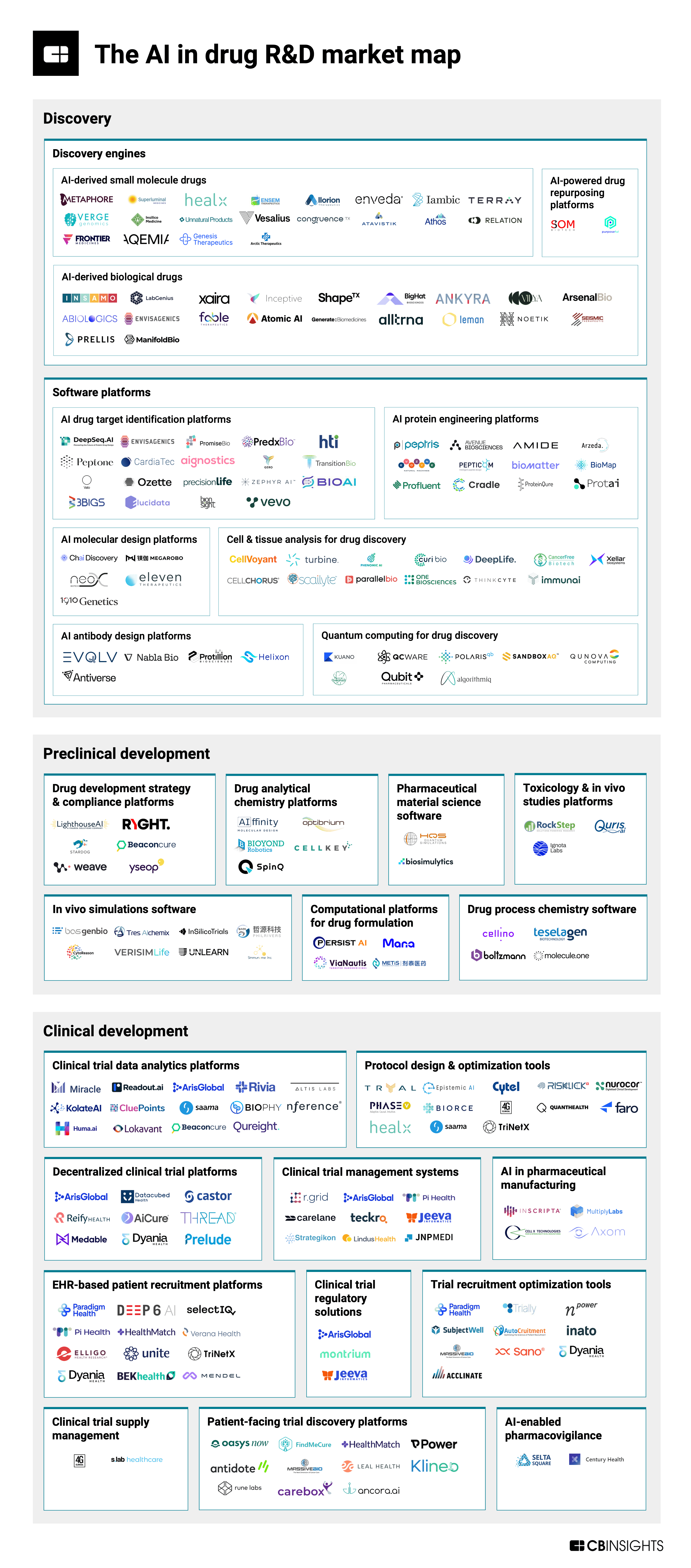 Categories on the market map align with our recent 3-part series on AI in drug R&D: