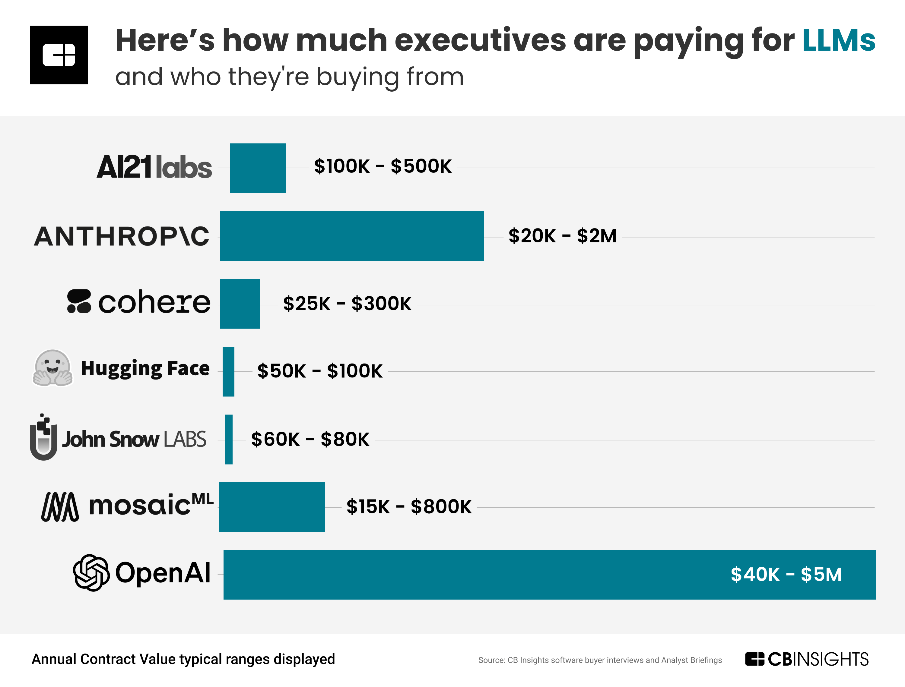 Interviews conducted by CB Insights with software buyers, as well as Analyst Briefing surveys submitted to CB Insights by startups, show enterprise budget allocations for LLMs entering the millions.