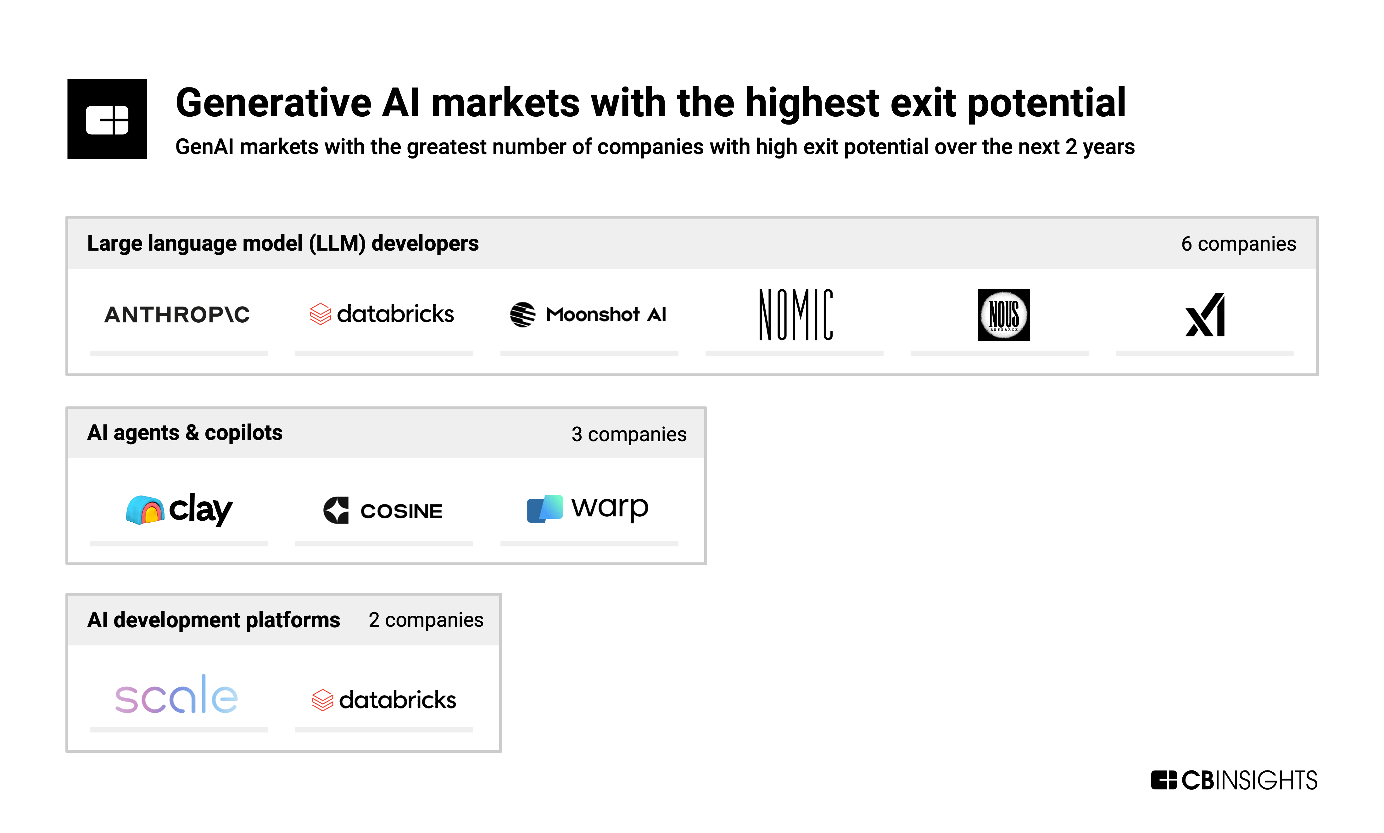 This analysis produced a shortlist of 50 genAI companies with high IPO potential relative to others (top 1%) or high M&A potential relative to others (top 5%). In particular, we saw high concentrations across 3 markets: large language model (LLM) developers, AI agents & copilots, and AI development platforms.