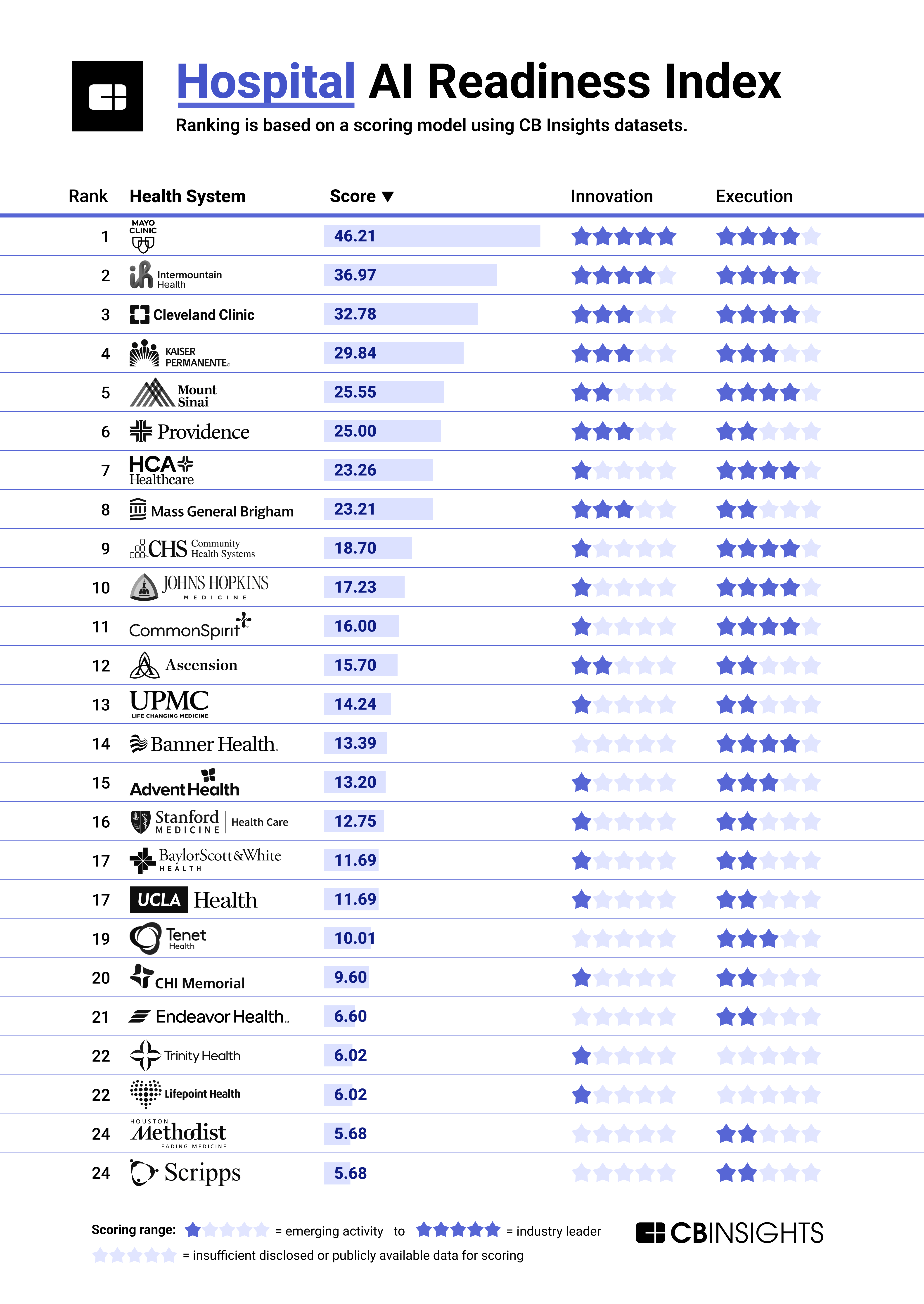We looked at the top private-sector health systems in the US (by hospital count) and ranked them based on how prepared they are to adapt to a rapidly evolving AI landscape across 2 key pillars: innovation and execution.