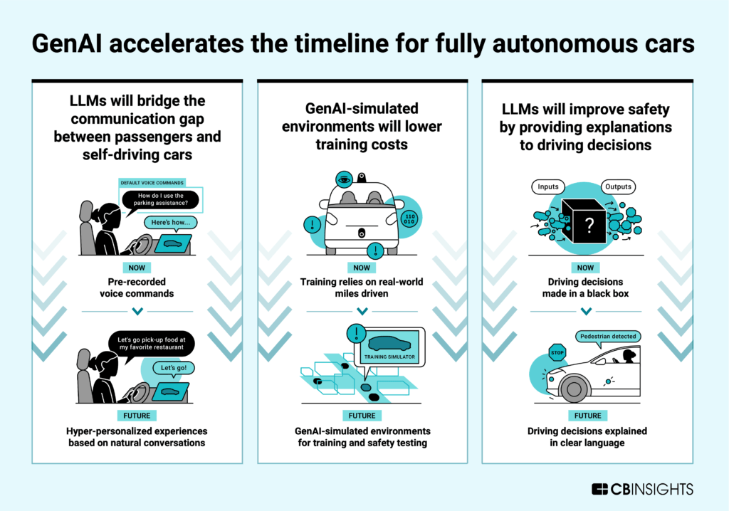 - Autonomous vehicle (AV) systems providers are using genAI to boost in-car voice assistant capabilities, reduce training costs, and improve safety and transparency.