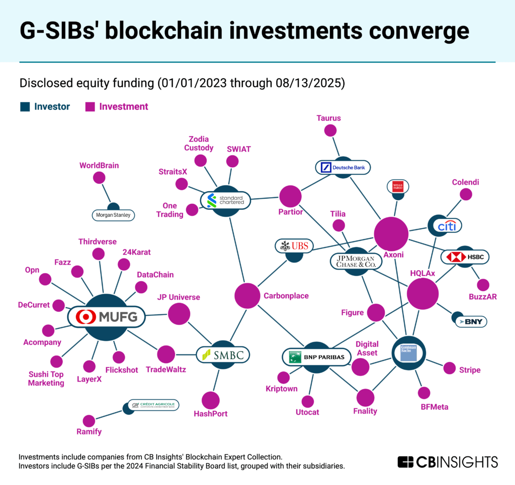 Yet this trend isn’t new — it’s been building for years with the 345 investments these institutions have made in the space between 2020 and 2024. In the visual below, we’ve highlighted the G-SIBs’ blockchain investments from 2023-present: