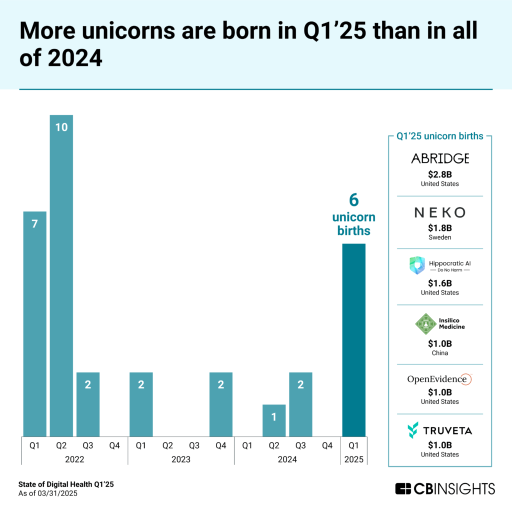 - Unicorn creation rebounds, driven by AI-native platforms. Digital health saw 6 new unicorns in Q1’25 — more than in all of 2024 — and the highest quarterly total since Q2’22. With half focused on AI for provider workflows, the data suggests investor conviction is highest where AI directly supports care delivery.