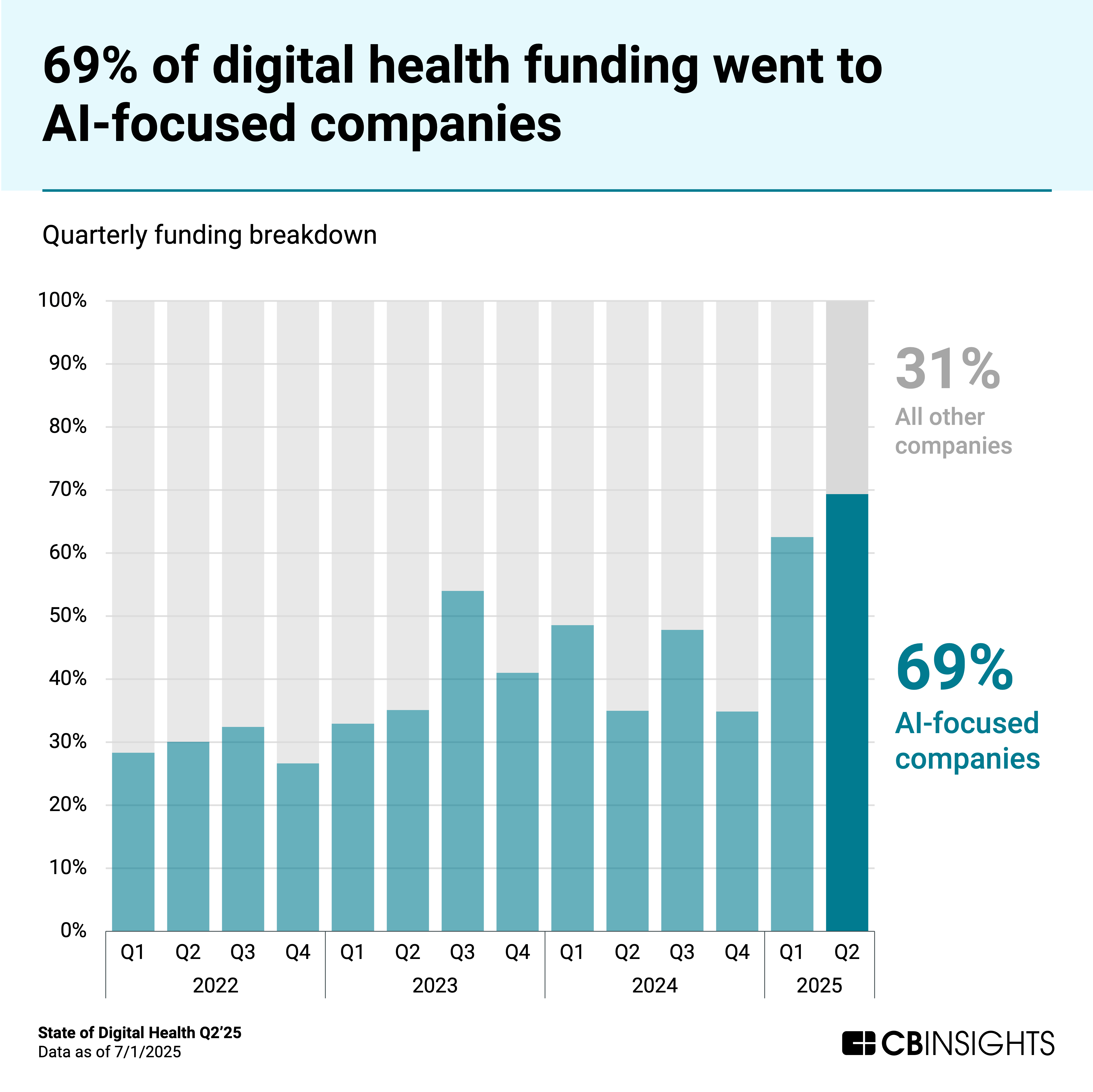 - AI companies captured more than two-thirds of digital health funding. AI startups raised $3B in Q2, accounting for 69% of all digital health funding, up from 60% in Q1. The AI deal share held steady from the previous quarter at 41%, with capital flowing to areas such as clinical documentation, brain-computer interfaces, and electronic health record (EHR) integration tools.