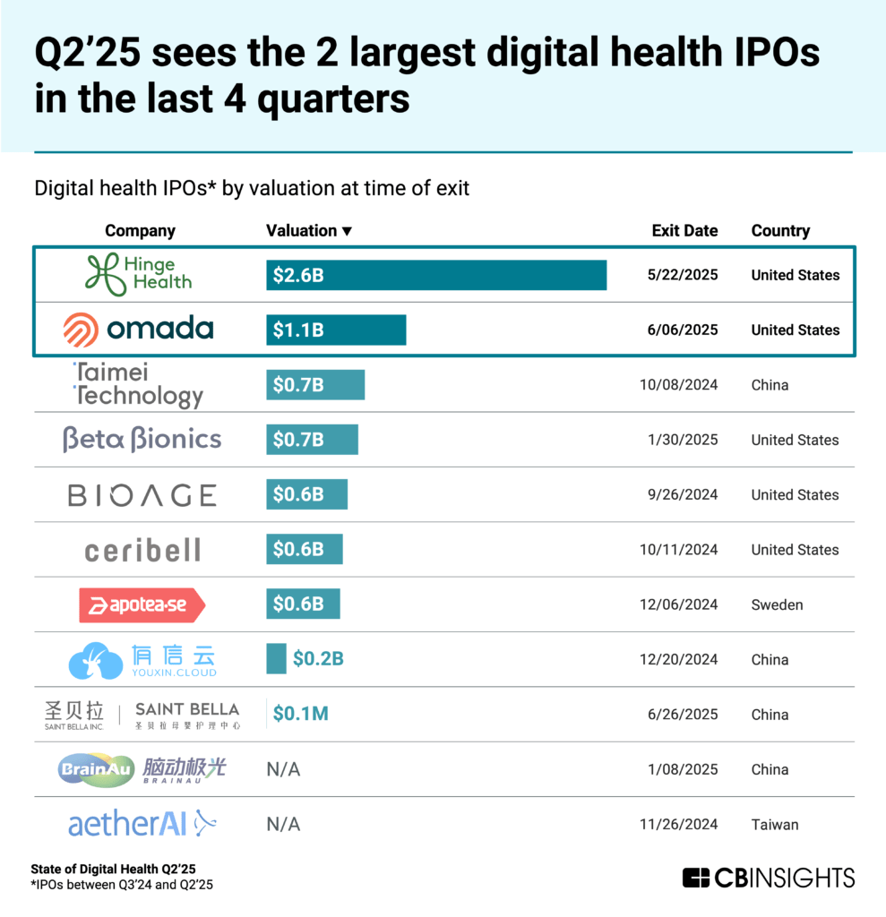 Digital health saw its first significant IPO activity in over a year, with Hinge Health and Omada Health debuting in Q2’25 at valuations of $2.6B and $1.1B, respectively.