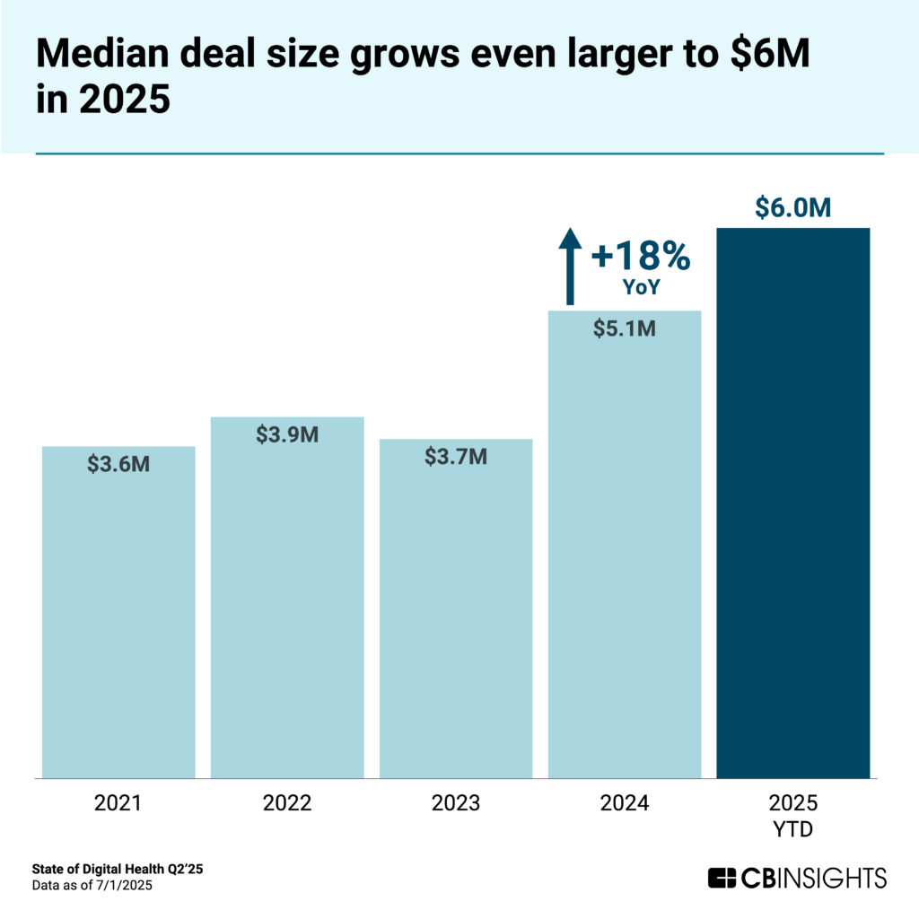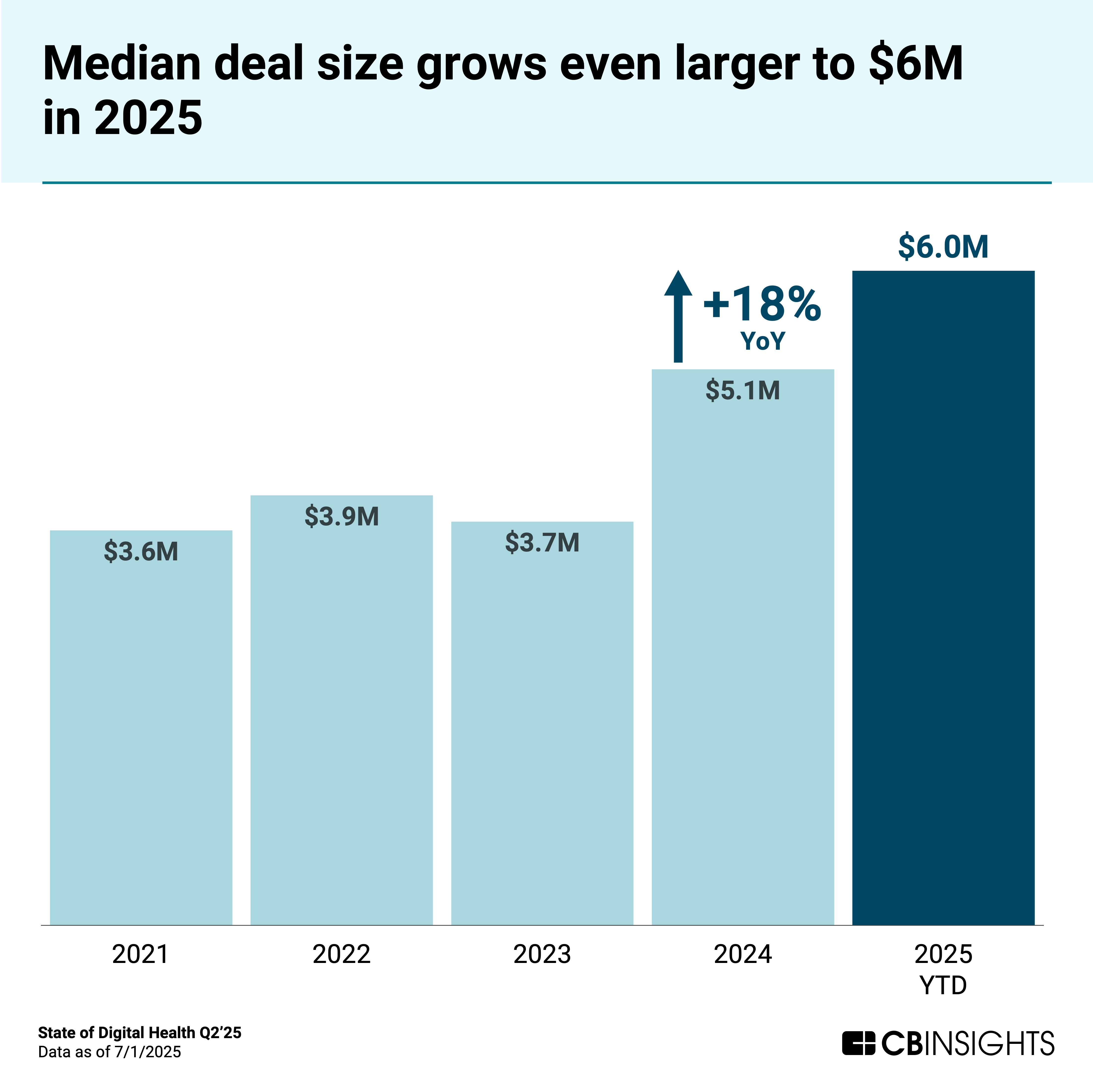 The global median digital health deal size reached $6M as of Q2’25, up from $5.1M in 2024, the highest level in the last 4 years. Also, the average deal size jumped to $22.2M, a 35% increase from 2024, reflecting a concentration of larger deals at the top.