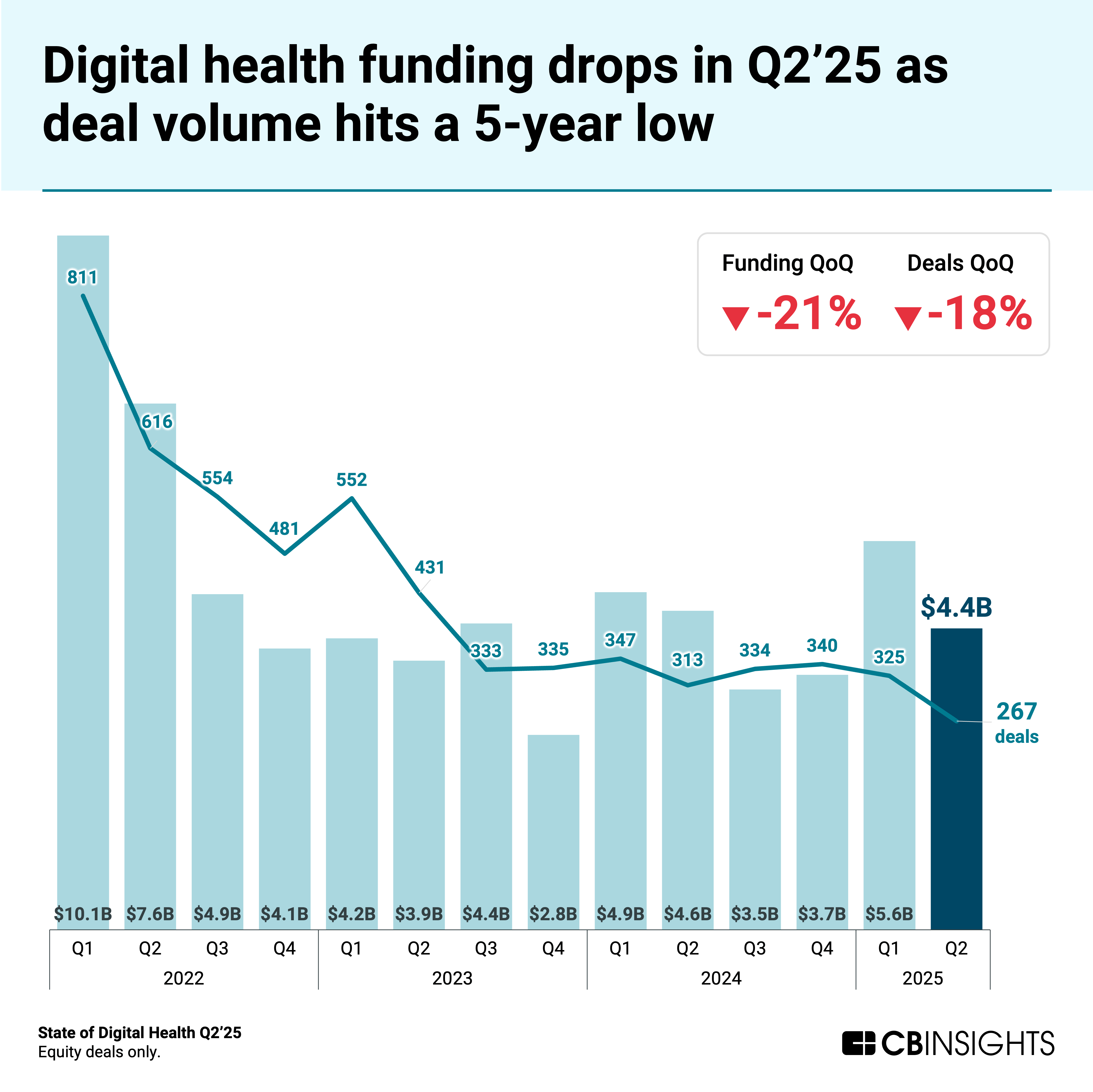 Digital health equity funding fell 21% QoQ in Q2’25, while deal volume dropped 18% to its lowest level in 5 years. This trend mirrors the broader venture landscape, where deal activity reached its lowest level since 2016.