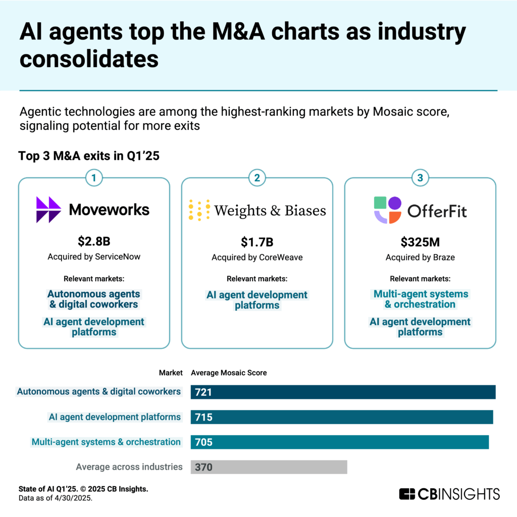 - AI agent companies lead M&A activity amid increasing consolidation. The 3 largest of 85 AI acquisitions in Q1’25 went to companies offering enterprise AI agent technology. The markets these companies occupy — like agent development platforms and multi-agent systems — boast among the highest average Mosaic scores across industries, reflecting strong company health and signaling the potential for more exits.