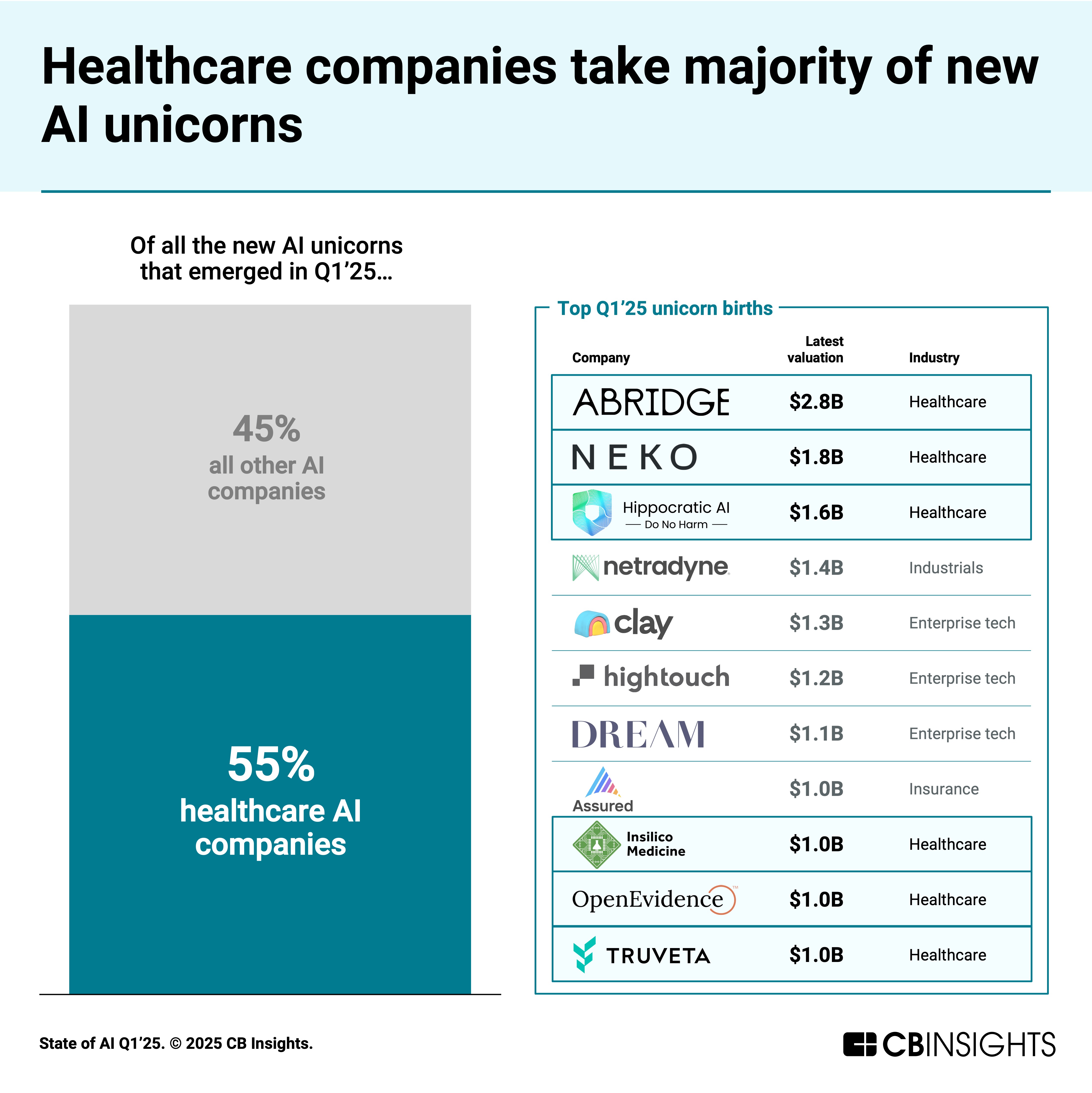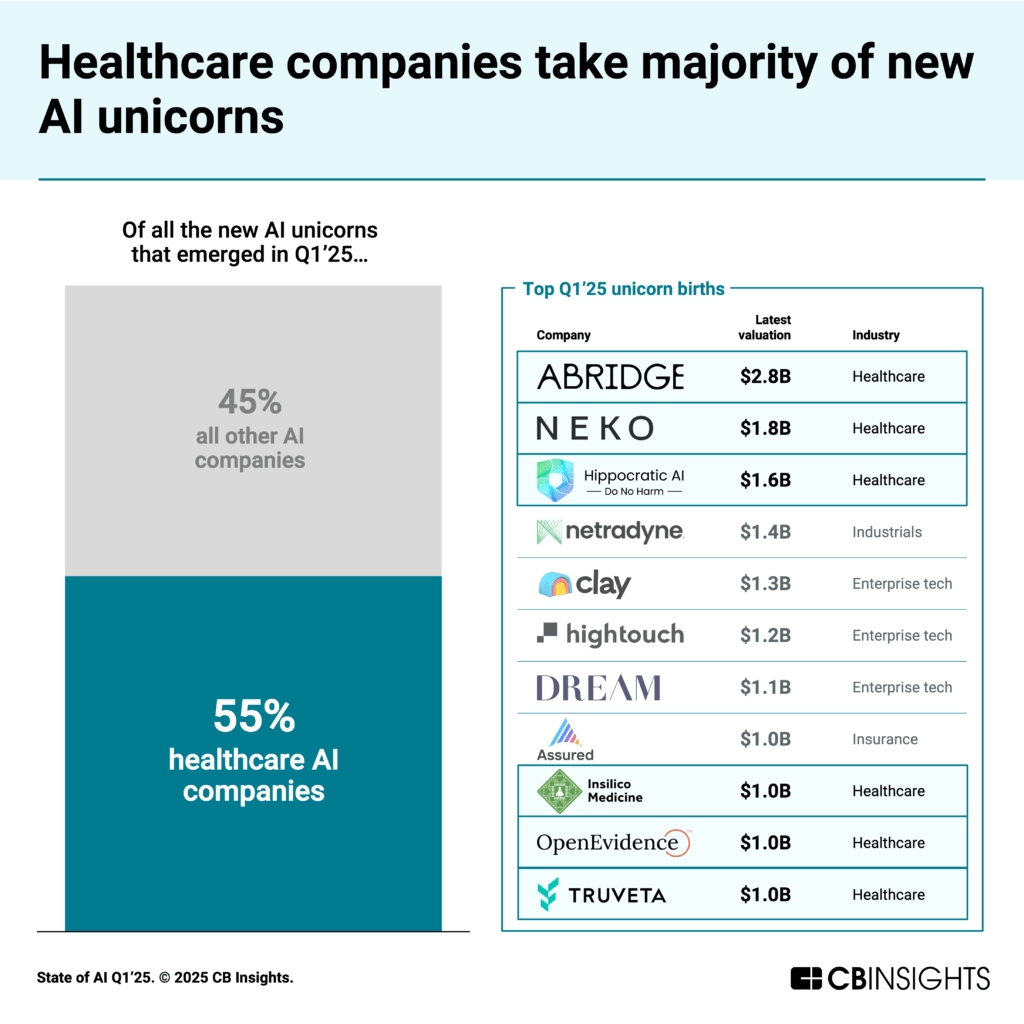 Healthcare companies claimed the majority of new AI unicorns in Q1’25, with 6 out of 11 total AI companies reaching the $1B+ milestone. Even when looking at the venture landscape beyond AI, healthcare AI players drove nearly 1 in 3 new unicorn births in Q1.
