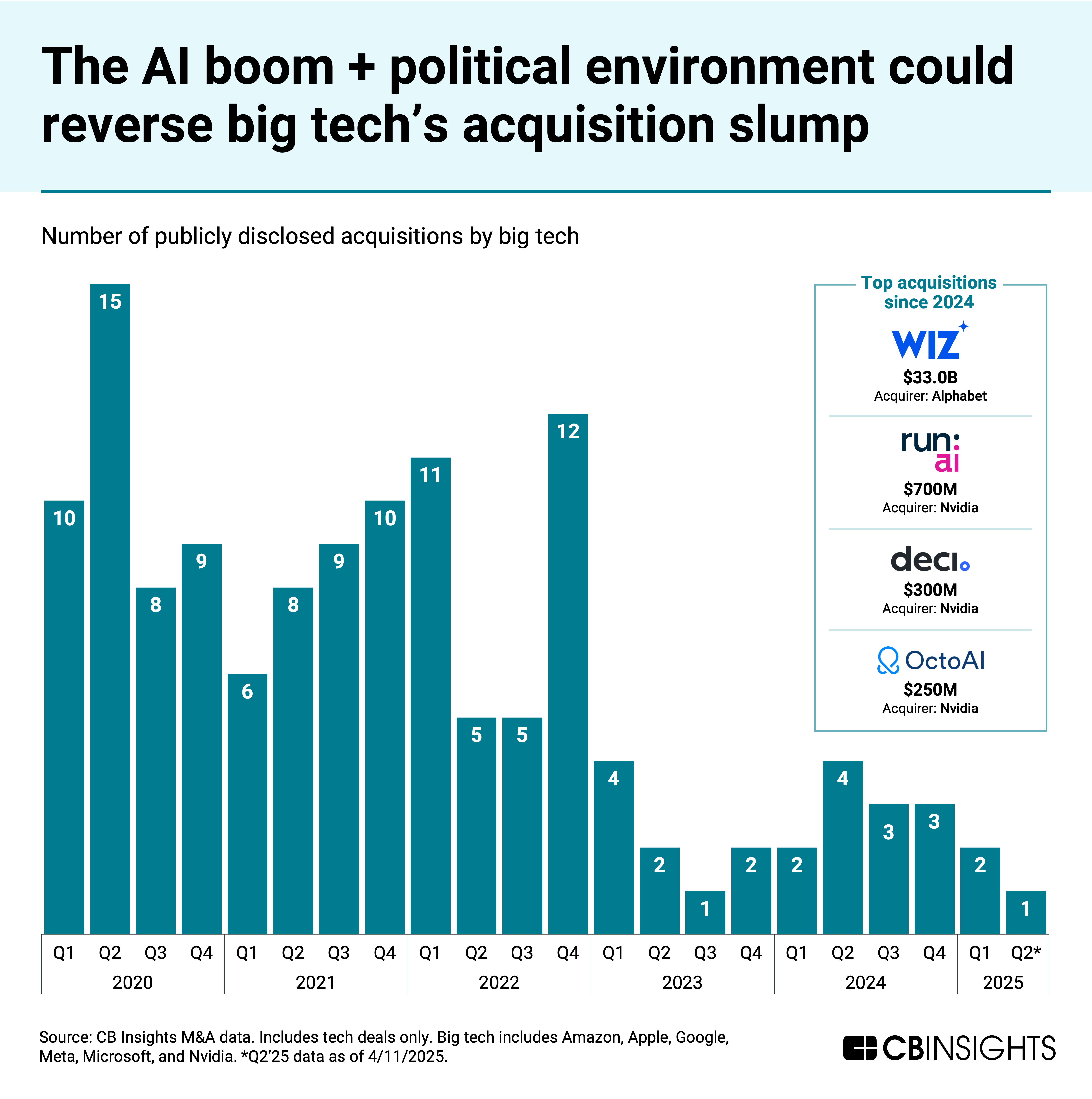 In 2024, Nvidia led acquisition activity, with a focus on companies optimizing AI workloads (Run:AI, Deci, Octo AI). It’s already made 2 more acquisitions in 2025 so far: synthetic data generation startup Gretel in March; and server-renting service Lepton AI in April.