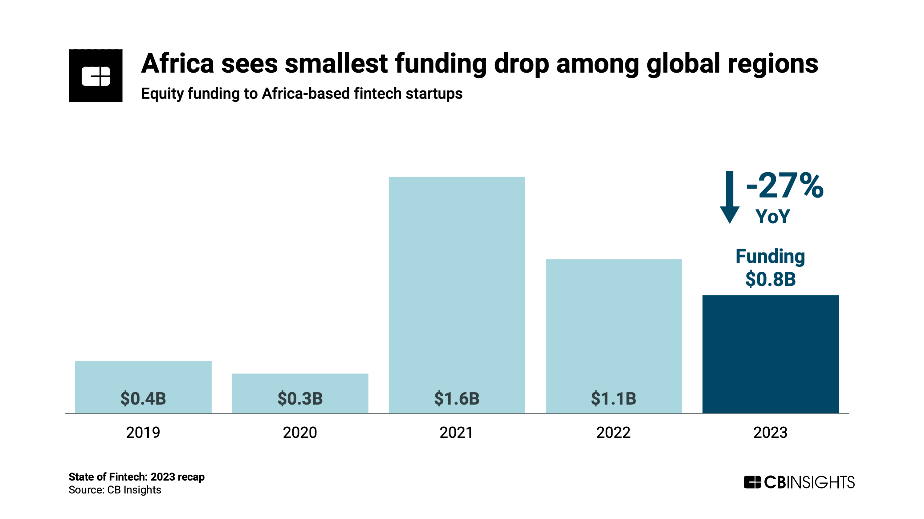 While fintech funding fell across every global region in 2023, Africa was the least affected by the downturn. Africa-based startups drew $0.8B in funding in 2023, down just 27% from 2022.