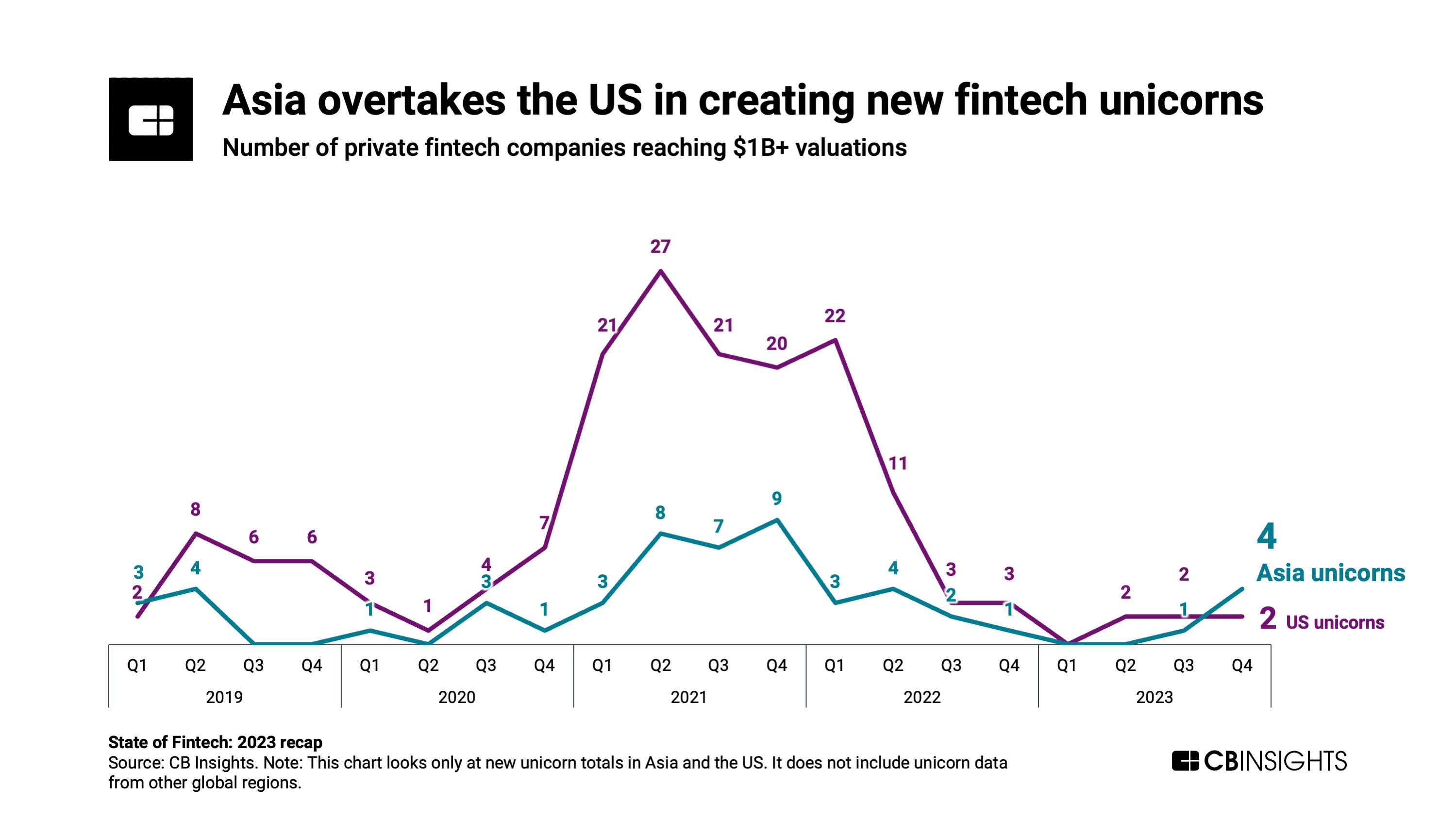This was the first time since 2019 that Asia outpaced the US in the number of new fintech unicorns in a single quarter.